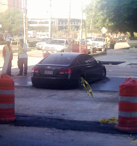 Οι αστυνομικές αρχές ανακοίνωσαν πως δέχθηκαν ένα τηλεφώνημα στις 8.30 το πρωί, από έναν εργάτη ο οποίος ανέφερε ότι ένα αυτοκίνητο είχε κολλήσει στο φρέσκο μπετό, σε ένα νέο τμήμα του δρόμου. Ο μάρτυρας, τόνισε ότι το αυτοκίνητο προσπάθησε να διασχίσει το τσιμέντο, παρά το γεγονός ότι η περιοχή είχε επισημανθεί με προειδοποιητικούς κώνους.